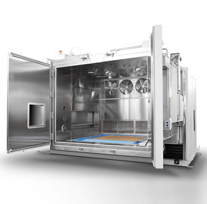 步入式试验箱应用于工业、自动化零组件汽车部件、电子电器件、塑胶、化工、制药工业及相关产品耐热、耐寒测试,用于大型零件、半成品、成品的温湿度环境测试,如:电脑终端机、汽车零组件。试验箱主要由控制面板、配电盘、保温库板、送风机、加热器、加湿器、冷冻机组合而成,主要规格可区分为6种标准室内尺寸及24种不同条件测试规范。